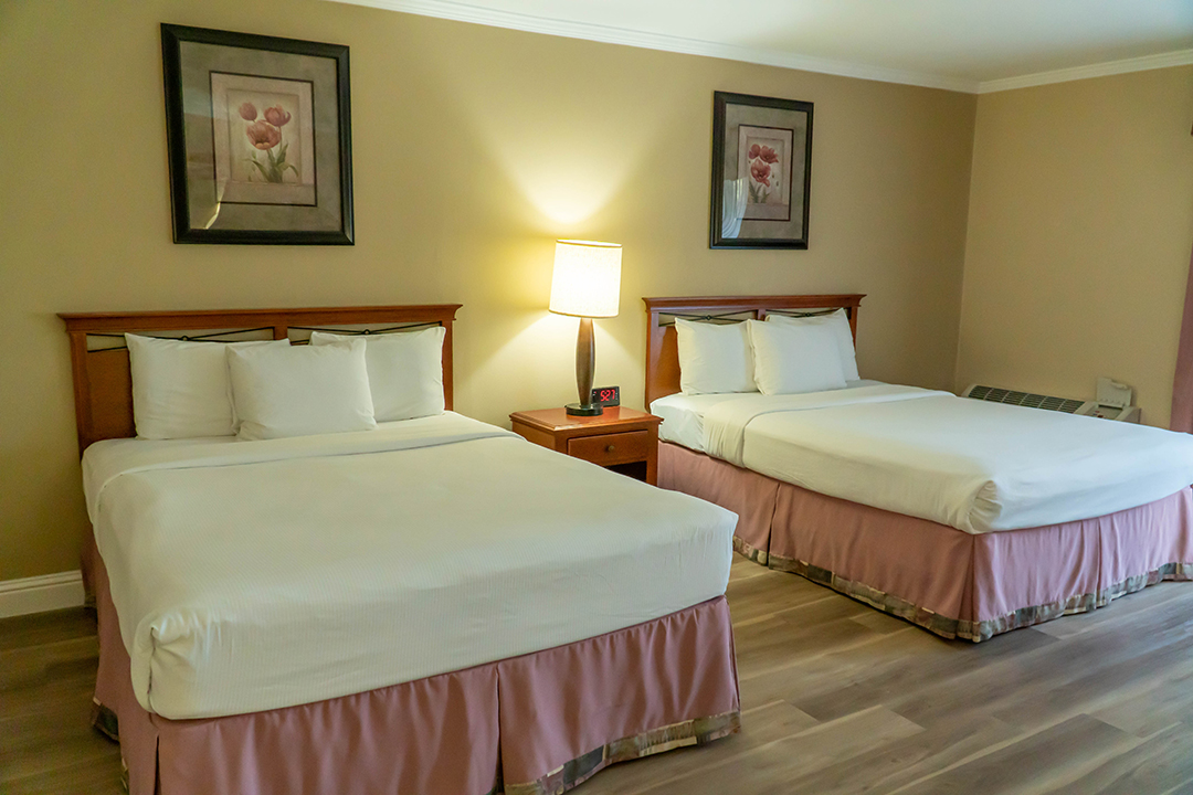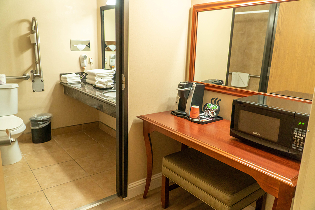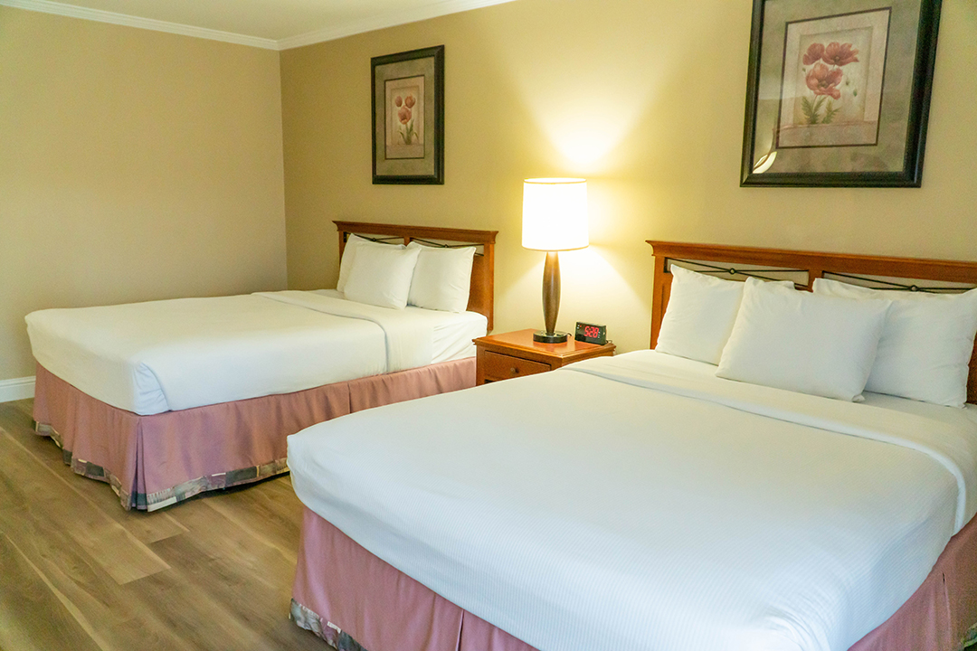 Our ADA complaint rooms feature 2 Queen Beds, a spacious 400 sq. foot living area, guaranteed to be located in one of our private single level bungalows spread out across our beautifully landscaped 7.5 acre garden property. ADA features include roll-in showers, grab bars for shower and toilet, portable shower chair, hand shower nozzle, reduced height peephole, security latch, and closet bars, and oversized entry and bathroom doors. Additional features include flat screen TV, high speed wi-fi, game table, Keurig coffee/tea maker, small fridge, microwave, and iron with ironing board.