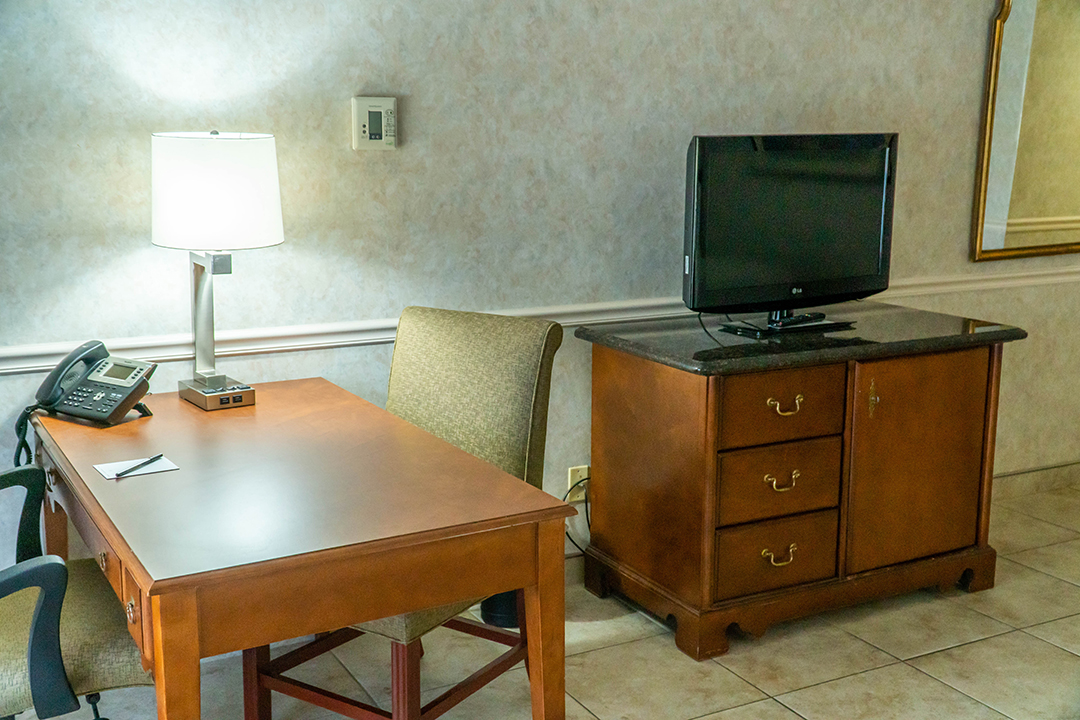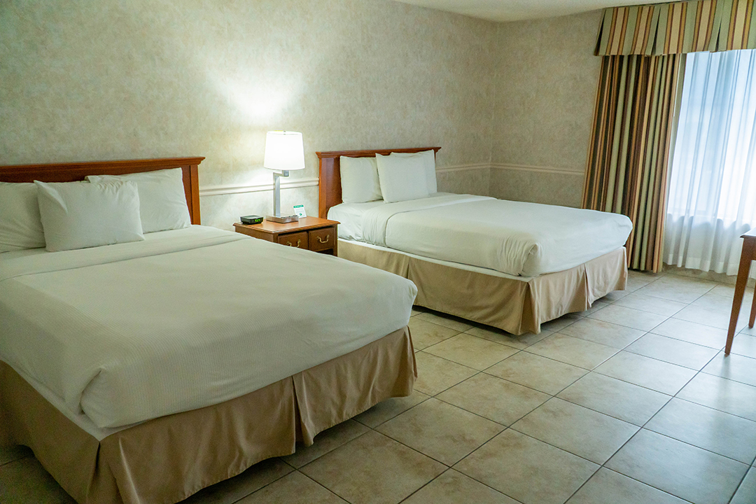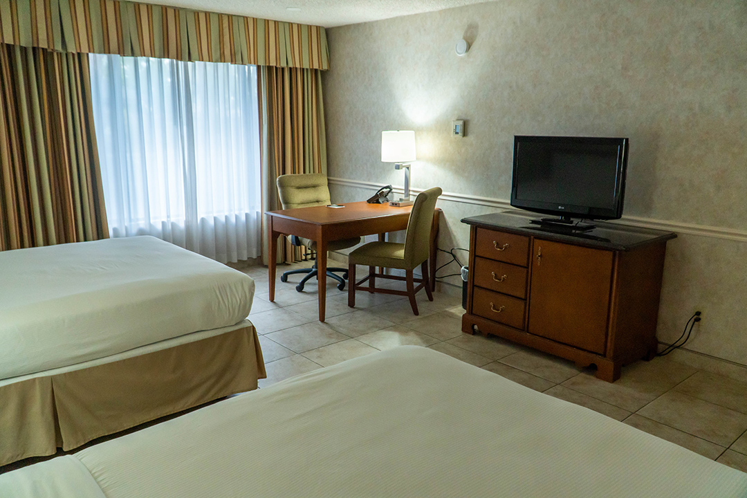 A cozy and dog friendly space with 2 Queen Beds, this 400 sq. foot room is just what the fur-family ordered. Featuring ceramic tile flooring for easy cleaning, flat screen TV, large work desk, high speed wi-fi, Keurig coffee/tea maker, small fridge, and iron with ironing board. Our outdoor dog relief area, with real grass and complimentary plastic bags, is located just steps outside your room. This room is located in a private single level bungalow in the rear of our beautifully landscaped 7.5 acres of garden property, perfect for walks with Fido! See our pet policy for additional details.